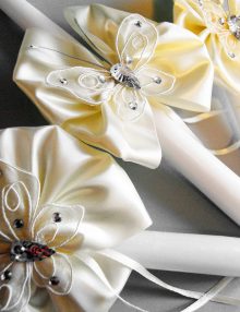 Set lumanari cristelnita cu panglici rosii si fluturasi albi