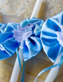 Set lumanari pentru cristelnita decorate cu floricele si fluturi bleu
