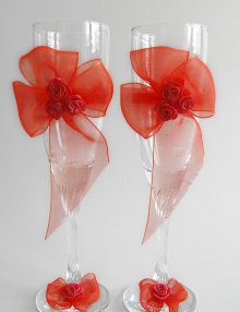 • Pahare pentru miri accesorizate cu trandafiri si fundite din organza rosie