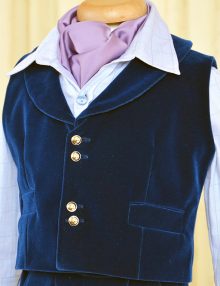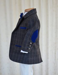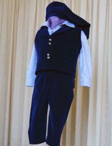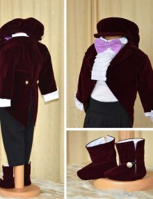 Pretul include: sacou cambrat, pantalon catifea, camasa bumbac, sepcuta, cizmulite si esarfa.