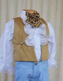 Costumas botez baietel model d'Artagnan, contine 5 piese: vestuta, pantalon, camasa din bumbac, botosei, boneta.