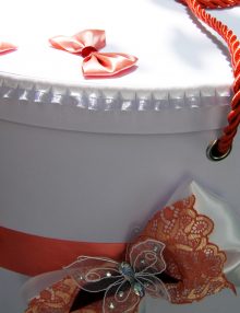 Un set de cutii trusou botez  frumos decorate cu funde din satin rosu, organza alba si ursuleti, realizate din carton, ce pot fi folosite pentru transportarea trusoului de botez al bebelusului si ulterior pentru pastrarea amintirilor dragi de la botez sau chiar pentru pastrarea jucariilor copilului. Cutia mica se poate folosi la transportarea sticlutei de mir, a prosopelului pentru preot si a sapunului, iar in cea mare se pot pune hainutele bebelusului, panza, fasa, prosopul mare si setul de 3 lumanari pentru cristelnita.