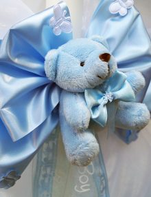 Lumanare botez pentru fetite, cu decor suav din tulle alb, funda dubla din tull, satin roz si un ursulet crem cu palariuta roz, panglica din organza roz inscriptionata cu textul It's a girl, snur crem impletit intr-un leagan pe care se joaca un al doilea ursulet crem si alte accesorii specifice - barza roz decor.Dimensiune lumanare: 90cm.