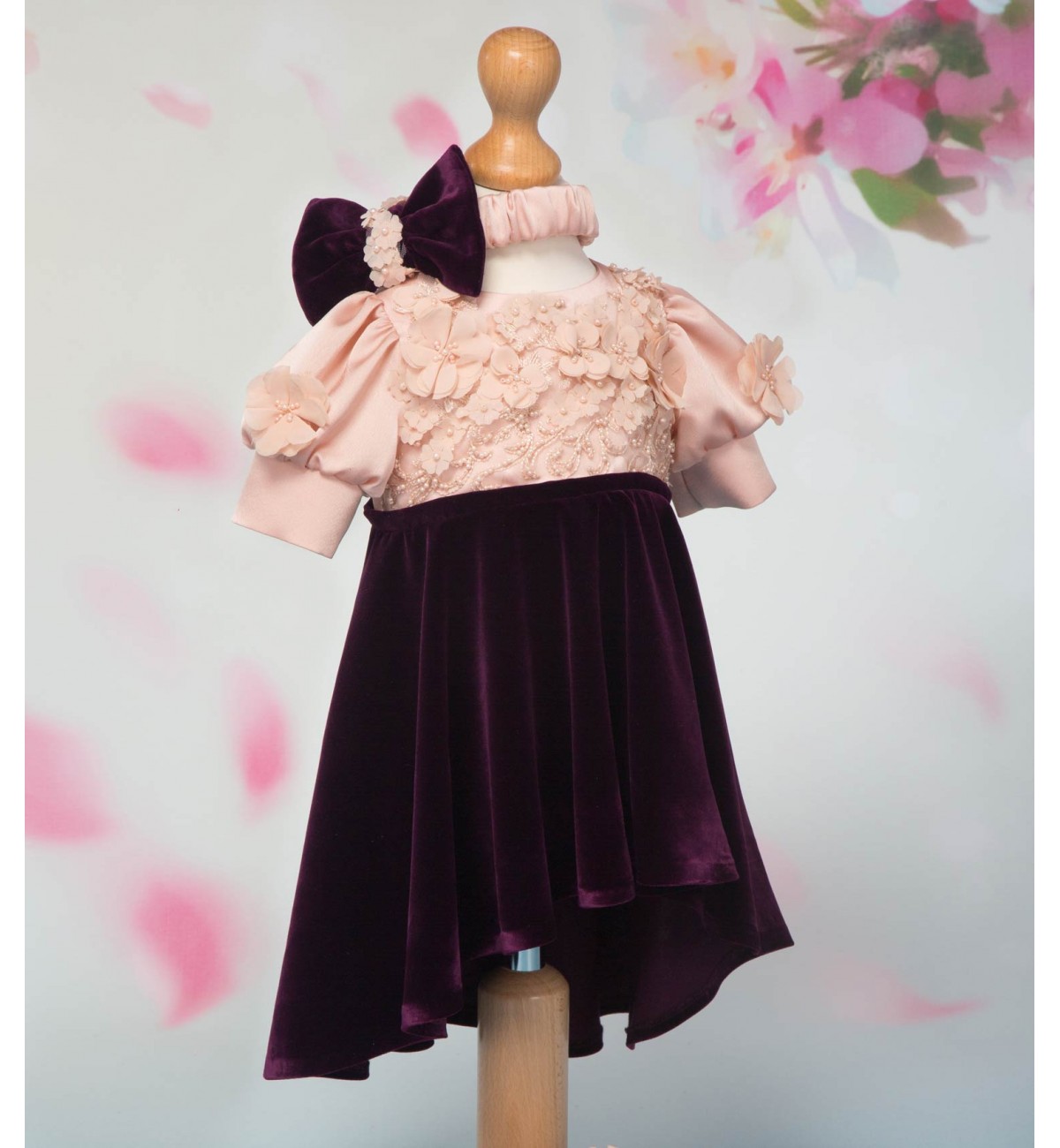 Rochita este in nuanta de bej si mov, iar contrastul cu dantela este evident. Are maneca scurta si pe alocuri am presarat floricele margelate. Catifeaua este pretioasa si foarte fina.