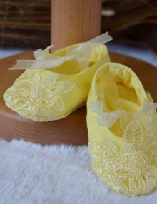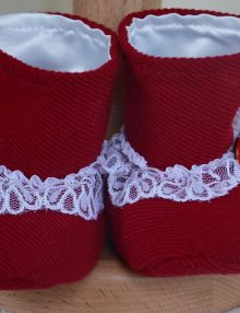 Set botez din dantela fucsia si aplicatii pe tull fin, contine 3 piese.