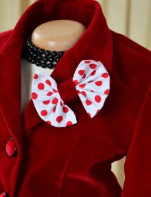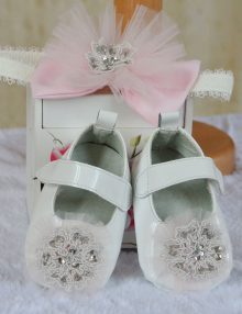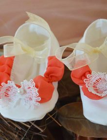 Set botez din dantela fucsia si aplicatii pe tull fin, contine 3 piese.