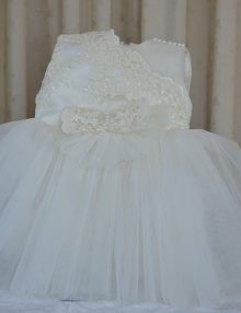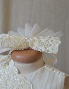 Set botez din dantela fucsia si aplicatii pe tull fin, contine 3 piese.