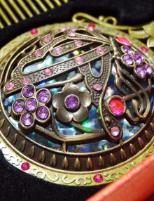 Setul cuprinde tăvița decorată, cutiuță pentru pus șuvița, forfecuta, fundița roșie, set de pieptăn și oglinda.