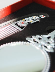Setul cuprinde tăvița decorată, cutiuță pentru pus șuvița, forfecuta, fundița roșie, set de pieptăn și oglinda.