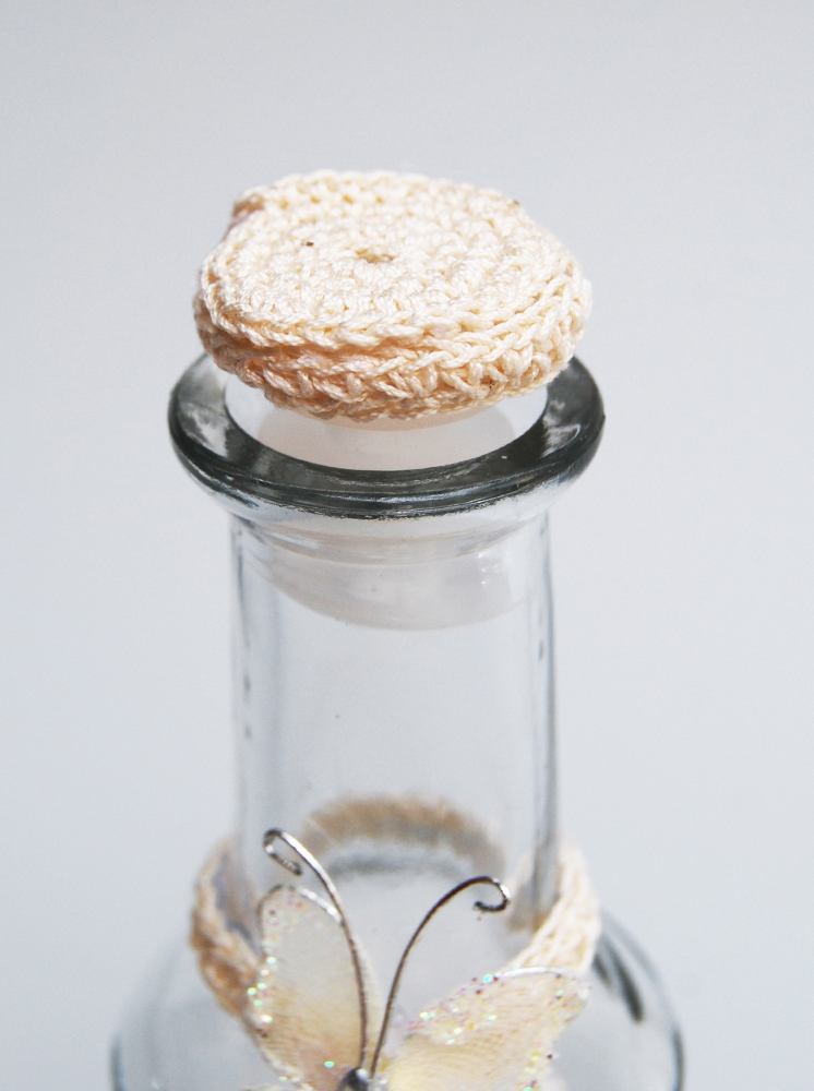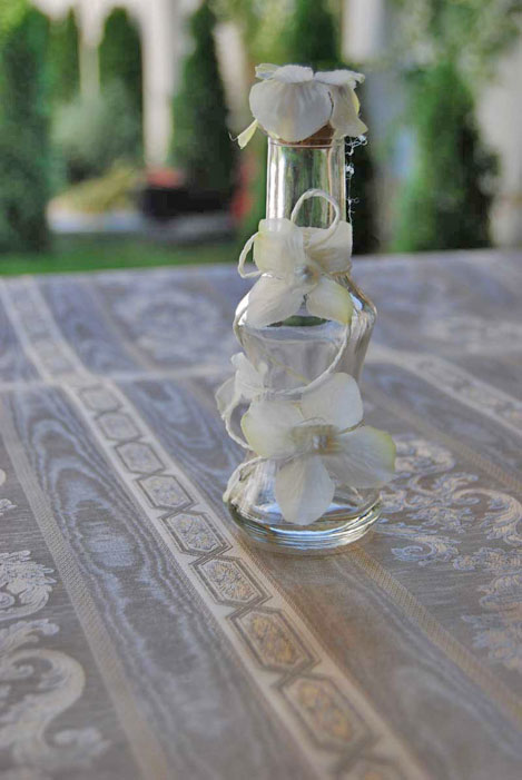 Sticla pentru uleiul de mir pentru ceremonia botezului, potrivita atat pentru baieti cat si pentru fetite. Suprafata sticlei este decorata elegant cu petale artificiale crem si rafie. Dopul poate fi din pluta sau plastic alb spiralat si este de asemenea decorat cu petale.