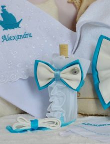 Setul Bebe contine: prosopul mare pentru bebe, panza de mir netivita si fasa. Prosopul si panza de mir pot fi personalizate la cerere cu numele copilului - 80RON