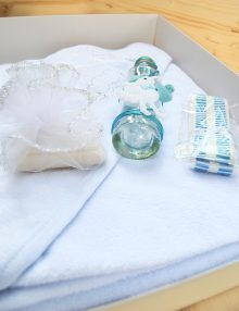 Setul Bebe contine: prosopul mare pentru bebe, panza de mir netivita si fasa. Prosopul si panza de mir pot fi personalizate la cerere cu numele copilului - 80RON