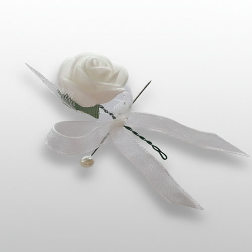 Cocardă de nuntă delicată, realizată cu trandafir alb simbol al purității, decorată cu fundiță elegantă din panglică și perlă decorativă. Un accesoriu rafinat, ideal pentru invitați, nași sau părinți, ce completează perfect atmosfera festivă a evenimentului.