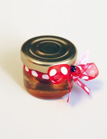 Marturie borcanel miere cu buburuza si panglica rosie inflorata