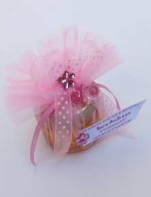 Marturie botez borcanel cu miere sau arahide glazurate cu organza roz si dantela eleganta